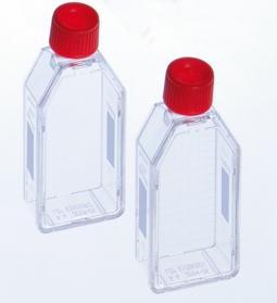 Standardní láhve pro buněčné kultury se standardním červeným šroubovacím uzávěrem.